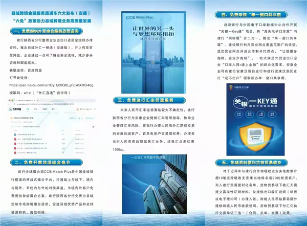 會(huì)上,中國(guó)建設(shè)銀行陜西分行相關(guān)負(fù)責(zé)人就縣域跨境金融服務(wù)直通車(chē)的模式、六免政策、外貿(mào)企業(yè)線上跨境金融產(chǎn)品進(jìn)行了介紹。