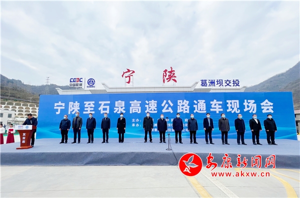 市委書記武文罡發(fā)布通車令。省交通運輸廳副廳長萬振江講話,葛洲壩集團副總經(jīng)理徐志國介紹寧石高速公路建設(shè)情況。市委常委、常務(wù)副市長高晶華致辭。副市長周耀宜主持。市人大常委會主任王彪、市政協(xié)主席周建功,市委常委、宣傳部部長、石泉縣委書記陳蓮,市政協(xié)副主席、寧陜縣委書記鄭紅丹,農(nóng)業(yè)銀行陜西省分行副行長薛雷,陜西交控集團黨委委員屈永照,葛洲壩集團交通投資有限公司董事長廖光榮,葛洲壩集團路橋工程有限公司總經(jīng)理吳海軍,省交通運輸廳總工程師伍石生,葛洲壩延黃寧石高速公路有限公司總經(jīng)理王勇出席會議。
