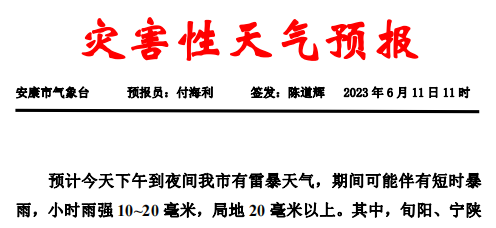 6月11日11時,安康市氣象臺發(fā)布災害性天氣預報:
