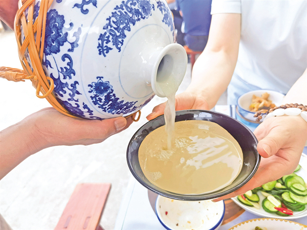 今年的漢江排子席是在復原的基礎上完善創(chuàng)新,有過安康門、開席、演唱漢江號子、安康非遺展示等多個環(huán)節(jié)。菜色方面,有四碗柱子果寓意四平八穩(wěn),插放梔子花、石榴花,寓意祥符瑞氣、多子多福,一壇黑陶稠酒,上放扎紅飄帶竹制酒提,開席后由祝酒仙子用酒提從酒壇斟酒。