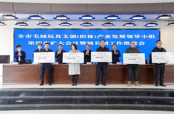 2022年10月18日,全市毛絨玩具文創(chuàng)(織襪)產(chǎn)業(yè)發(fā)展領(lǐng)導(dǎo)小組第四次擴(kuò)大會(huì)議上表彰兌現(xiàn)了一次性獎(jiǎng)補(bǔ)資金1000萬元