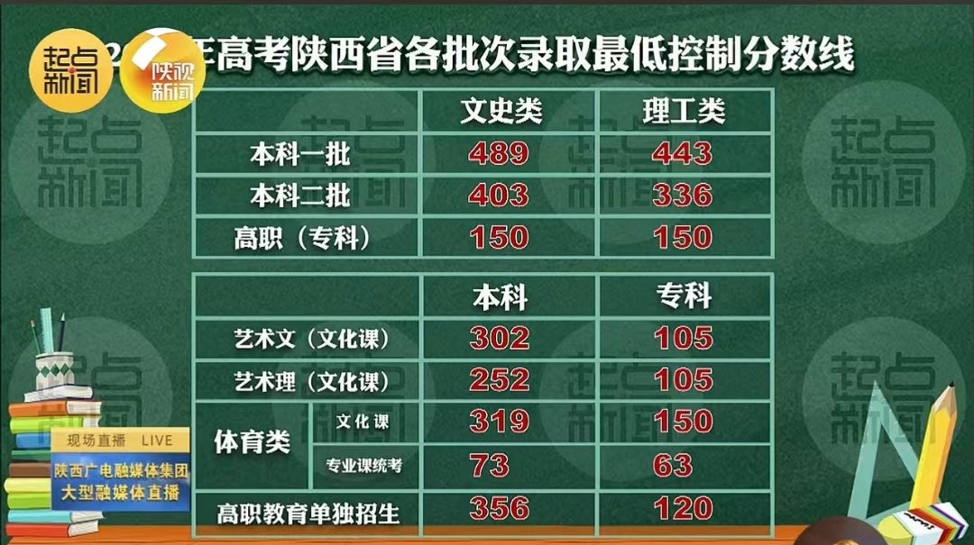 本網(wǎng)訊 6月24日,據(jù)2023年陜西省高考各批次錄取分?jǐn)?shù)線新聞發(fā)布會公布,陜西的文史類分?jǐn)?shù)線,本科一批489分、二批403分、?疲ǜ呗殻┡150分;理工類分?jǐn)?shù)線本科第一批為443分、第二批336分、?疲ǜ呗殻┡150分。