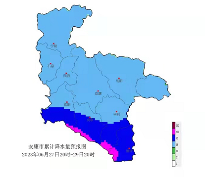 本網訊 6月25日17時,安康市氣象臺發(fā)布重要天氣報告:預計6月27日夜間至29日白天我市有一次較強降雨天氣過程。預計過程累計雨量全市大部地區(qū)30-50毫米,紫陽、嵐皋、平利、鎮(zhèn)坪50-80毫米(個別鎮(zhèn)辦超過100毫米),主要降雨時段集中在28日白天到29日上午,過程期間可能伴有短時暴雨,最大小時雨強可達20-40毫米。具體預報如下: