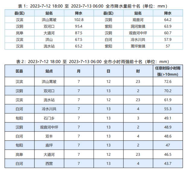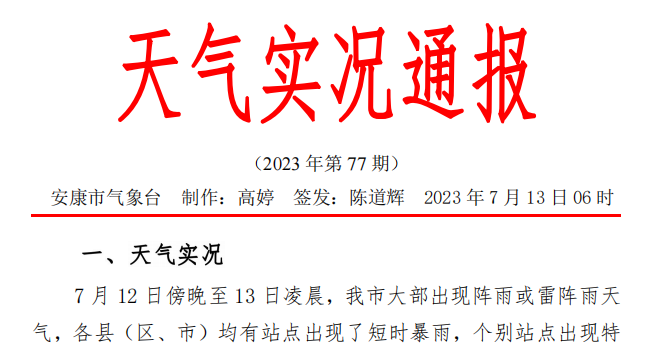 7月12日傍晚至13日凌晨,我市大部出現(xiàn)陣雨或雷陣雨天氣,各縣(區(qū)、市)均有站點(diǎn)出現(xiàn)了短時(shí)暴雨,個(gè)別站點(diǎn)出現(xiàn)特大暴雨(≥50毫米/小時(shí)),部分地區(qū)出現(xiàn)了6—8級短時(shí)大風(fēng)和強(qiáng)雷電。據(jù)統(tǒng)計(jì),過去12小時(shí)(2023年7月12日18時(shí)至7月13日06時(shí))全市共有191個(gè)氣象監(jiān)測站出現(xiàn)了降雨,累計(jì)降水量5毫米(中雨)以上有138站,15毫米(大雨)以上有94站,30毫米(暴雨)以上有47站,70毫米(大暴雨)以上有3站,其中單站雨量最大為漢濱區(qū)洪山蒿坡氣象監(jiān)測站102.8毫米,最大小時(shí)雨強(qiáng)出現(xiàn)在漢濱區(qū)洪山蒿坡72.6毫米(7月12日22時(shí)-23時(shí))。安康城區(qū)氣象監(jiān)測站38.6毫米。