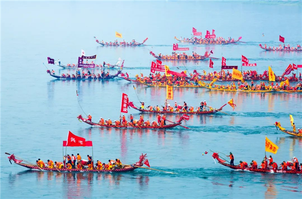 安康龍舟競(jìng)渡的場(chǎng)面有多火?從清康熙年間的《石泉縣志·風(fēng)俗》記載里可以感受一下:“鼓樂盈街,紅榴綠艾,命索虎符,饋送竟日。官僚尉具席于樓船,敦請(qǐng)長(zhǎng)令觀龍舟競(jìng)渡。男女盈岸……左顧右盼,應(yīng)接不暇。終日而后驂掉,皆游倦而言旋矣。”