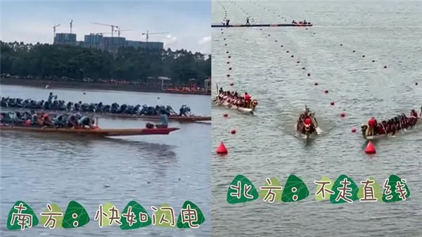 前不久的端午節(jié),關(guān)于南北方人龍舟賽的對(duì)比視頻被拉出來玩壞了。視頻中的北方龍舟代表隊(duì)看起來姿勢(shì)笨拙,頻頻翻船,網(wǎng)友調(diào)侃:紀(jì)念屈原主打一個(gè)“下水陪伴”;而畫面中的南方龍舟代表隊(duì)把龍舟玩出了花,S彎漂移、彈射起步信手拈來,主打一個(gè)同舟共濟(jì)。