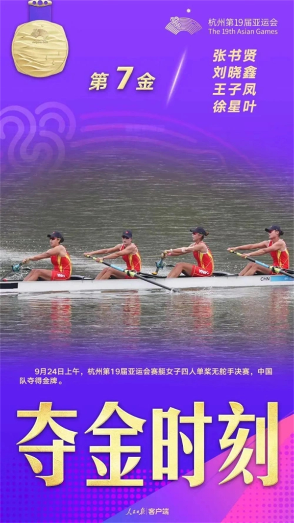 9月24日上午,在杭州亞運(yùn)會(huì)賽艇女子4人單槳無(wú)舵手決賽中,中國(guó)組合張書賢、劉曉鑫、王子鳳、徐星葉獲得金牌,其中徐星葉來(lái)自陜西安康,這是陜西運(yùn)動(dòng)員在本屆亞運(yùn)會(huì)獲得的首枚金牌。