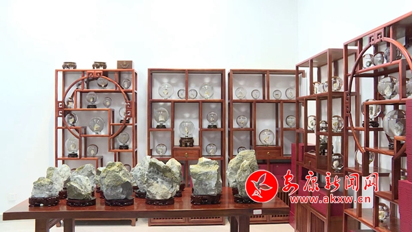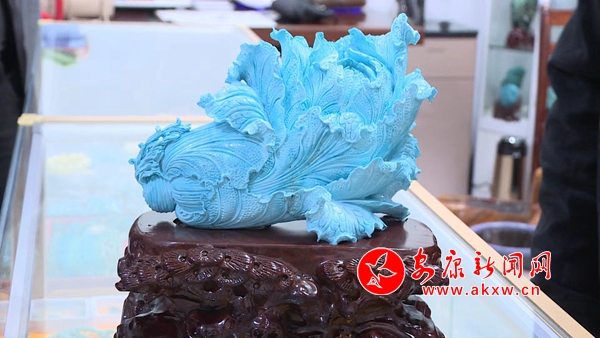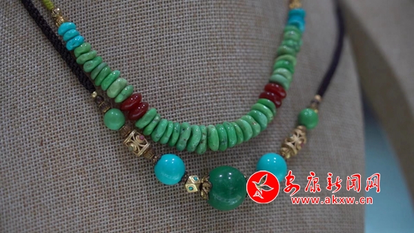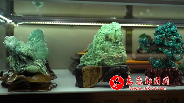 松石展柜中,擺放著各類精致時尚的綠松石飾品,這些通過雕刻家設計打磨后的擺件、項鏈、手鏈、耳墜等,都是藝術臻品,它們吸引著人們的目光,讓人愛不釋手。