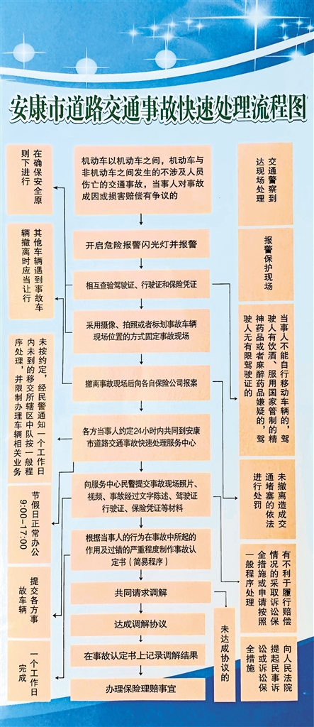為減少因發(fā)生交通事故導(dǎo)致的擁堵,提高交警交通事故處理工作效率,提供快捷的車(chē)輛保險(xiǎn)理賠維修等相關(guān)服務(wù),緩解交通壓力,保障市民安全暢通出行。2015年我市成立了道路交通事故快速處理服務(wù)中心(以下簡(jiǎn)稱(chēng)快處中心)受理安康市城市規(guī)劃區(qū)內(nèi)(包括漢濱區(qū)、高新區(qū)、瀛湖風(fēng)景區(qū))發(fā)生的輕微交通事故。