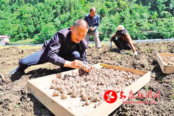 藺河鎮(zhèn)蔣家關(guān)村產(chǎn)業(yè)大戶、立新魔芋農(nóng)民專業(yè)合作社負責(zé)人的王永成,挑選基地培育適應(yīng)當(dāng)?shù)卦苑N高產(chǎn)魔芋種子下田。