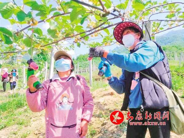 宏大農(nóng)業(yè)公司獼園中工人正在人工授粉。