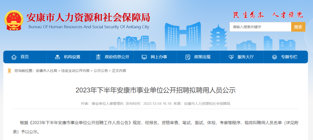 12月4日,安康市人力資源和社會(huì)保障局發(fā)布2023年下半年安康市事業(yè)單位公開(kāi)招聘擬聘用人員公示。