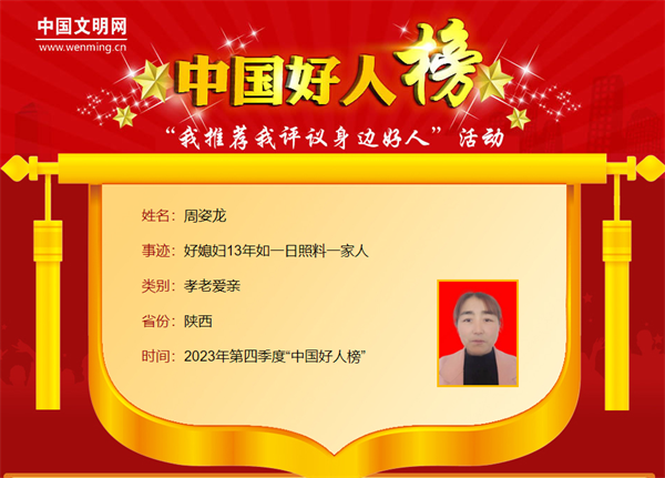 周姿龍,女,1969年8月生,陜西省安康市漢濱區(qū)晏壩鎮(zhèn)泰山廟村村民。丈夫車禍摔跤致癱在家后,周姿龍堅(jiān)強(qiáng)地挑起了生活的重?fù)?dān)。13年來,她護(hù)理身體癱瘓的丈夫、照顧精神障礙的姑姐、照料年事已高的公公,用自己的堅(jiān)定和責(zé)任,為家人撐起了一片愛的天空。