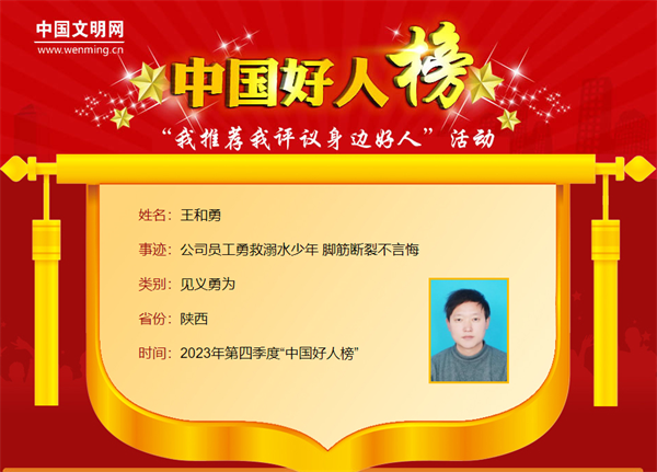 王和勇,男,1987年8月生,陜西省水務(wù)公司職工。在少年溺水的危機(jī)時(shí)刻,王和勇忘記自己“準(zhǔn)爸爸”的身份,毫不猶豫跳進(jìn)水流湍急的河里奮勇施救。王和勇曾獲“陜西好人”榮譽(yù)。