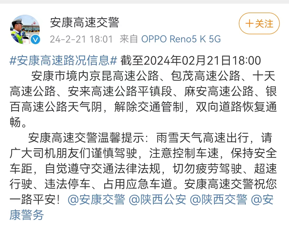 2月21日18時,安康高速交警發(fā)布消息:截至2024年02月21日18:40,安康市境內京昆高速公路、包茂高速公路、十天高速公路、安來高速公路平鎮(zhèn)段、麻安高速公路、銀百高速公路天氣陰,解除交通管制,雙向道路恢復通暢。 禁止;愤\輸車輛和七座以上客車駛入高速。ric安康新聞網