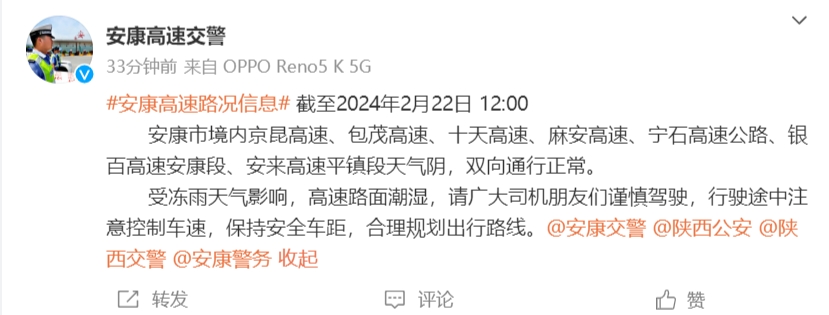 據(jù)安康高速交警消息:截至2024年2月22日12:00,安康市境內(nèi)京昆高速、包茂高速、十天高速、麻安高速、寧石高速公路、銀百高速安康段、安來高速平鎮(zhèn)段天氣陰,雙向通行正常。受凍雨天氣影響,高速路面潮濕,請廣大司機朋友們謹慎駕駛,行駛途中注意控制車速,保持安全車距,合理規(guī)劃出行路線。 hKJ安康新聞網(wǎng)
