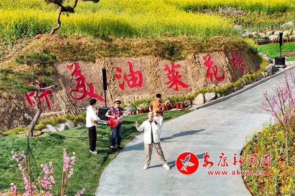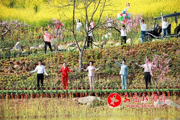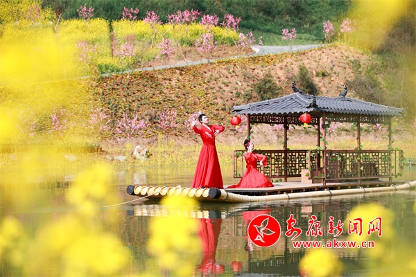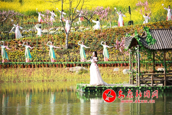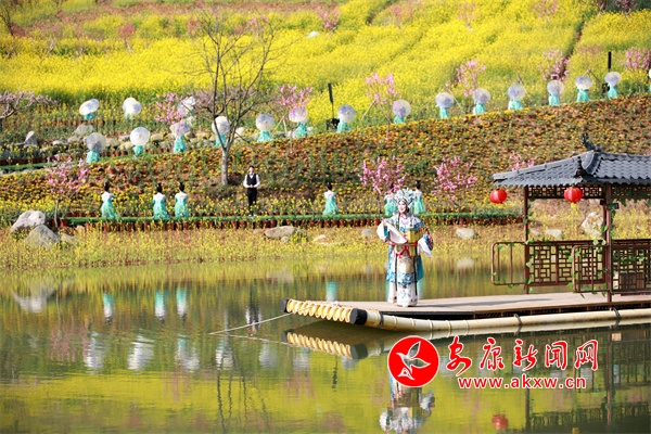 春日的水田溝村生機勃發(fā),漫山的油菜花在暖陽下爭相怒放,山坡下是一汪清澈的湖水;顒右郎骄蛣荨⑺懖⒂,將演員、舞臺、道具與水田溝村地形地貌完美融合,營造出“人在畫中游,畫在景中走”的和美景象。隨著原創(chuàng)歌曲《水田溝的油菜花》悠揚動聽的歌聲從湖面的小船傳來,活動正式拉開帷幕,獨唱《問春》、情景詩朗誦《母親河》、歌伴舞《醉美桃花源》、情景劇《桃花源記》、漢劇歌舞《喬木花》、原創(chuàng)歌曲《阿依娜》、歌伴舞《幸福安康》等精彩節(jié)目相繼上演,悠揚的歌聲、曼妙的舞姿在湖上、在油菜花田、在蜿蜒的山路漸次呈現(xiàn),將現(xiàn)場觀眾和游客迅速帶入安康桃花源美麗夢幻的油菜花海世界,沉浸式感受安康高新區(qū)產(chǎn)城綠融合發(fā)展和鄉(xiāng)村振興的顯著成效。