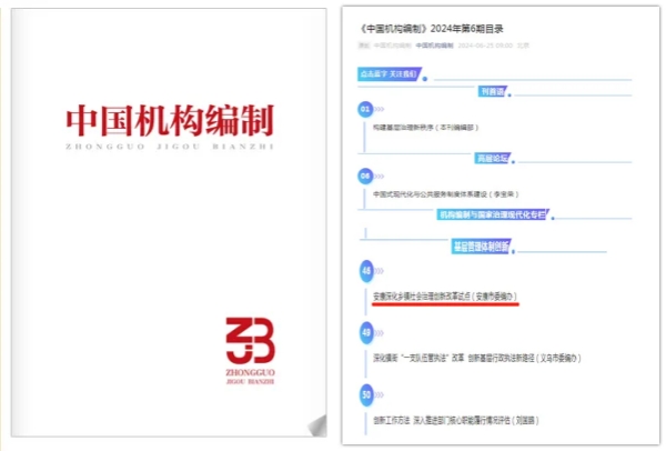 6月25日,《中國機構(gòu)編制》2024年第6期以題為《安康深化鄉(xiāng)鎮(zhèn)社會治理創(chuàng)新改革試點》刊發(fā)我市深化鄉(xiāng)鎮(zhèn)社會治理創(chuàng)新改革試點經(jīng)驗文章,這也是繼《安康推進機構(gòu)編制監(jiān)督檢查全覆蓋》、《部門機構(gòu)編制事項動議初探》、《深化審批服務(wù)便民化改革》,我市機構(gòu)編制管理創(chuàng)新經(jīng)驗和調(diào)研成果第四次在全國機構(gòu)編制系統(tǒng)最高權(quán)威期刊“上榜”。