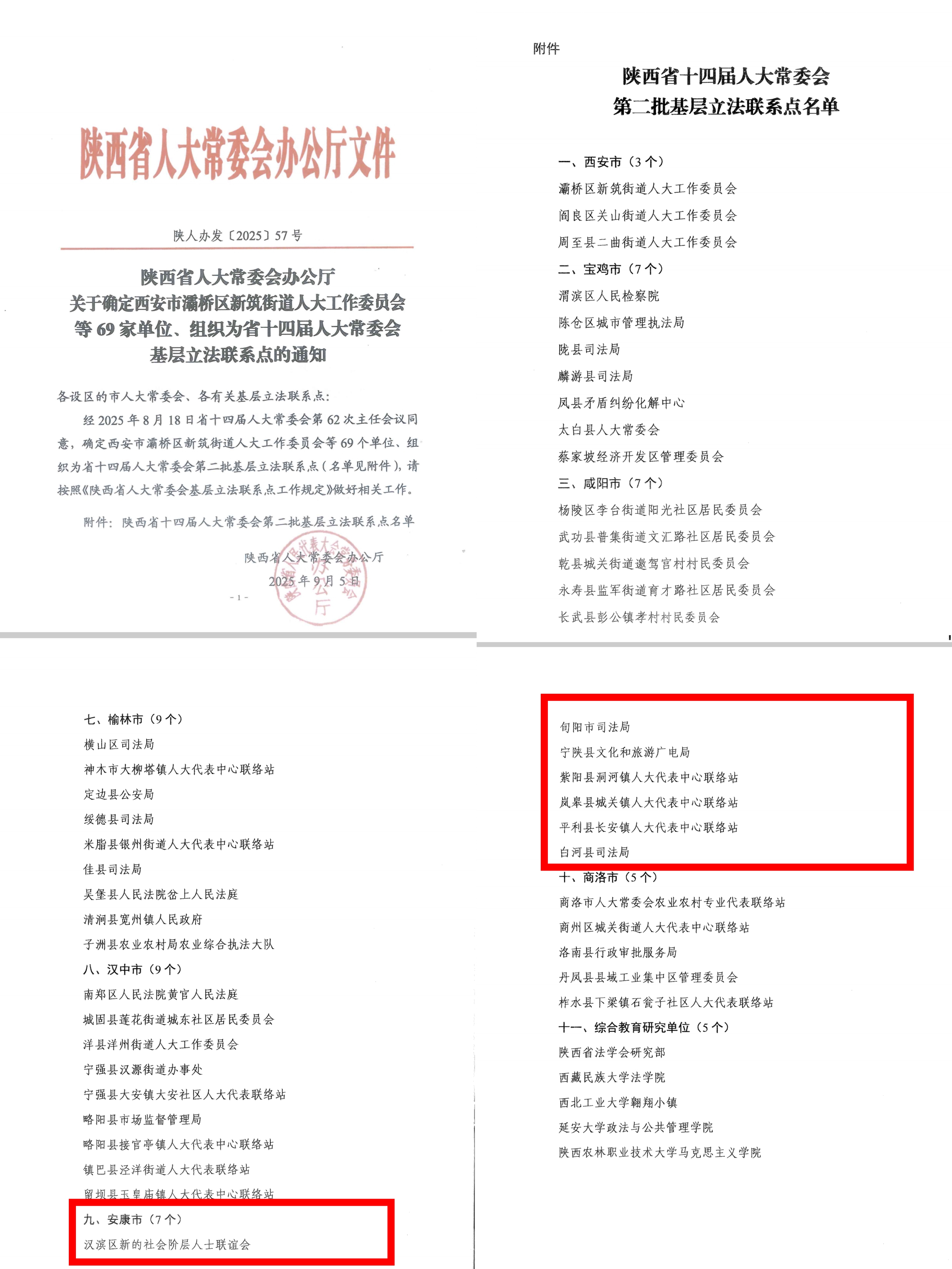 本網(wǎng)訊(通訊員 段文貞)9月5日,省人大常委會公布《陜西省十四屆人大常委會第二批基層立法聯(lián)系點名單》,我市漢濱區(qū)新的社會階層人士聯(lián)誼會、旬陽市司法局、寧陜縣文化和旅游廣電局、紫陽縣洞河鎮(zhèn)人大代表中心聯(lián)絡(luò)站、嵐皋縣城關(guān)鎮(zhèn)人大代表中心聯(lián)絡(luò)站、平利縣長安鎮(zhèn)人大代表中心聯(lián)絡(luò)站、白河縣司法局7家單位、組織成功入選。這是繼2023年省人大常委會在我市確立首批4個基層立法聯(lián)系點以來,通過綜合考核、嚴(yán)格篩選再次確立的7個基層立法聯(lián)系點,實現(xiàn)了全市各縣(市、區(qū))全覆蓋。