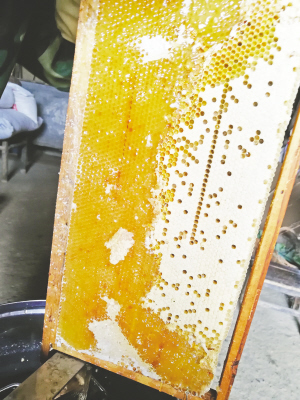 在貧困戶劉合英家,整齊擺放在房前屋后的16個(gè)蜂箱格外耀眼。來自養(yǎng)蜂合作社的技術(shù)員“全副武裝”,戴上手套和養(yǎng)蜂帽后輕輕打開一個(gè)蜂箱蓋,提出蜂脾,用力地上下?lián)u晃,將附著在蜂脾上的蜜蜂搖下來后,用長尖刀割去蜂蠟,濃稠金黃的蜂蜜順著蜂脾流淌,讓人垂涎欲滴。蜂蠟割下來后,技術(shù)員在搖蜜機(jī)的兩個(gè)卡位里各放上一塊蜂脾,開始快速地轉(zhuǎn)動(dòng)搖柄,借助搖蜜機(jī)將蜂蜜從巢脾內(nèi)甩出,并順著桶壁流到桶底。技術(shù)員又拿出過濾網(wǎng),將搖出來的蜂蜜用過濾網(wǎng)過濾,過濾完后純凈的蜂蜜被裝入儲(chǔ)藏桶里。“真甜!”嘗了一口后,劉合英笑著說。