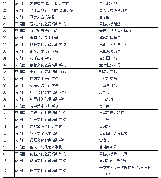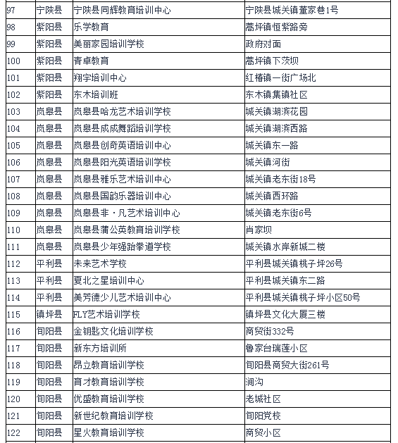 為進(jìn)一步規(guī)范我市校外培訓(xùn)機(jī)構(gòu)辦學(xué)行為,有效遏制當(dāng)前存在的中小學(xué)生課外負(fù)擔(dān)不斷加重的突出問題,保障中小學(xué)生健康成長(zhǎng),各縣區(qū)按照安康市教育局、公安局、民政局、人力資源和社會(huì)保障局、工商行政管理局聯(lián)合印發(fā)的《關(guān)于切實(shí)減輕中小學(xué)生課外負(fù)擔(dān)開展校外培訓(xùn)機(jī)構(gòu)專項(xiàng)治理行動(dòng)的通知》(安教發(fā)〔2018〕33號(hào))和全市校外培訓(xùn)機(jī)構(gòu)專項(xiàng)治理行動(dòng)推進(jìn)會(huì)要求,由教育行政部門牽頭,會(huì)同公安、民政、人社、市場(chǎng)監(jiān)管等部門和鎮(zhèn)街聯(lián)合執(zhí)法,開展了摸底排查工作。截止5月底,全市共排查民辦非學(xué)歷文化教育培訓(xùn)機(jī)構(gòu)540家,其中具有辦學(xué)資質(zhì)的培訓(xùn)機(jī)構(gòu)141家,無辦學(xué)許可證的培訓(xùn)機(jī)構(gòu)399家。現(xiàn)將具有辦學(xué)資質(zhì)的校外培訓(xùn)機(jī)構(gòu)名單和無辦學(xué)許可證的校外培訓(xùn)機(jī)構(gòu)名單予以公布。請(qǐng)有需求的學(xué)生和家長(zhǎng)務(wù)必選擇具有辦學(xué)資質(zhì)的校外培訓(xùn)機(jī)構(gòu)參加培訓(xùn)。為保障中小學(xué)生健康成長(zhǎng)和廣大受教育者合法權(quán)益,禁止學(xué)生到無辦學(xué)許可證的校外培訓(xùn)機(jī)構(gòu)參加培訓(xùn)。