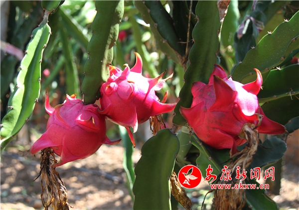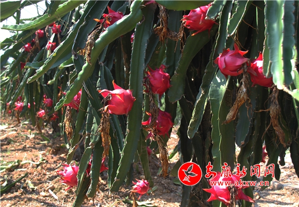 王浩家有二十多畝地用來(lái)種植紅心火龍果,坡上一個(gè)大棚,坡下三個(gè),優(yōu)良的光照條件讓這里成熟的火龍果皮薄、肉厚、果汁充盈。據(jù)了解,火龍果的生長(zhǎng)周期為當(dāng)年7月到次年2月,只要悉心種植,可20年不換種苗連續(xù)掛果。“今年雨水充沛,氣溫也正合適,預(yù)計(jì)可產(chǎn)2萬(wàn)斤,喜歡的朋友可以過(guò)來(lái)采摘“,王浩站在被紅艷艷的火龍果塞得滿滿當(dāng)當(dāng)?shù)拇笈锢,喜滋滋地說(shuō)到。