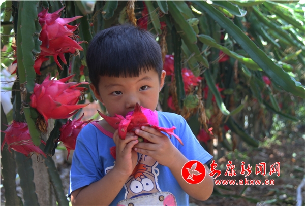 此時(shí)的王家臺(tái)村早已沒(méi)有了車(chē)水馬龍,而這里更有種“悠然見(jiàn)南山“的清新灑脫。微風(fēng)習(xí)習(xí),陽(yáng)光正好,王浩家的小兒子在田間跑來(lái)跑去,抱著火龍果吃的正香,看到此景讓人不禁感嘆道:王家臺(tái)的火紅豐收季,到了。