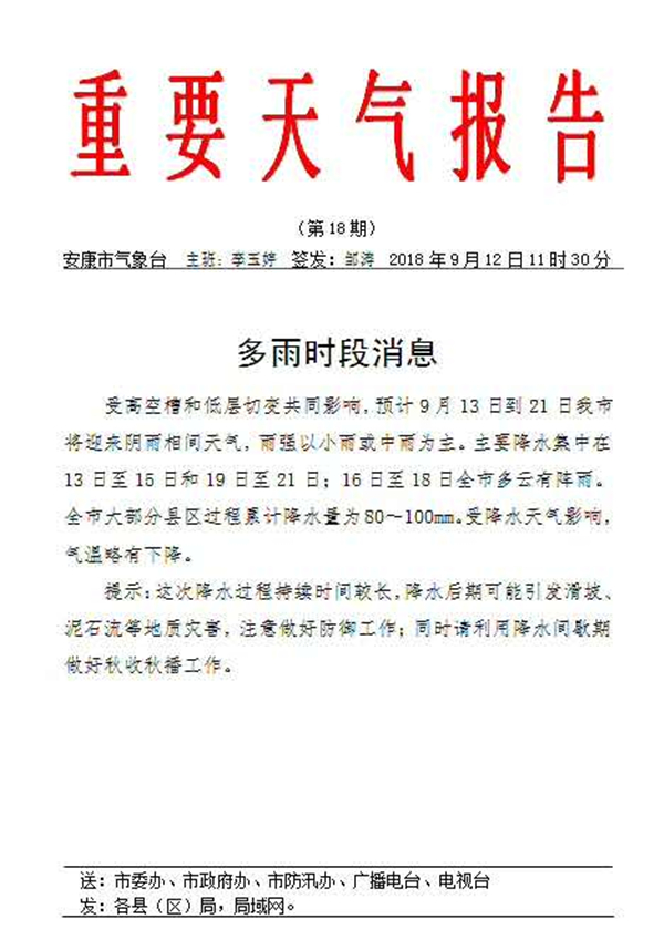 安康氣象臺(tái)11時(shí)30分發(fā)布降雨預(yù)報(bào),受高空槽和低層切變共同影響。預(yù)計(jì)9月13日到21日我市將迎來陰雨相間天氣。yKb安康新聞網(wǎng)