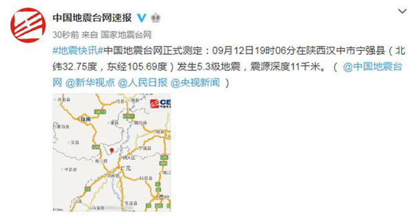 中國地震臺網(wǎng)正式測定:09月12日19時06分在陜西漢中市寧強(qiáng)縣(北緯32.75度,東經(jīng)105.69度)發(fā)生5.3級地震,震源深度11千米。QzP安康新聞網(wǎng)
