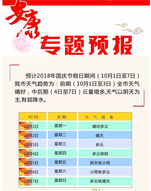 節(jié)假日期間我市天氣晴好,氣溫較適宜出游,但早晚氣溫較低,氣溫波動(dòng)較大,后期受冷空氣影響,6日至7日氣溫將會(huì)有所下降。