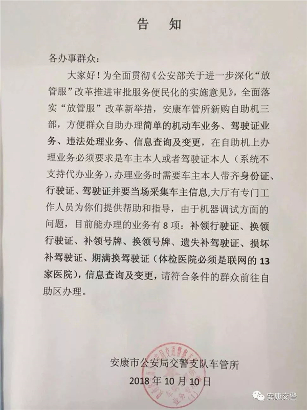 為全面貫徹落實公安部“放管服”改革新舉措,安康市公安局交警支隊車管所新購自助機三部,方便群眾自助辦理簡單的機動車、駕駛證、違法處理、信息查詢及變更等業(yè)務,車主和駕駛員本人(系統(tǒng)不支持代辦業(yè)務)只需持身份證、行駛證、駕駛證,當場采集車主信息、辦理業(yè)務。車管所大廳自助服務設備目前能自助辦理的業(yè)務有8項::補領行駛證、換領行駛證、補領號牌、換領號牌、遺失補駕駛證、損壞補駕駛證、期滿換駕駛證(體檢醫(yī)院必須是聯(lián)網(wǎng)的13家醫(yī)院),信息查詢及變更。