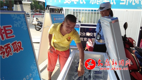 安康新聞網(wǎng)訊(記者 張世虎)安康劇院十字路口,環(huán)衛(wèi)工人李力清掃完路邊后,汗水已濕透衣衫。不像往常一樣坐在樹蔭下休息,他徑直來到了對面的冰柜跟前。與其他冰……