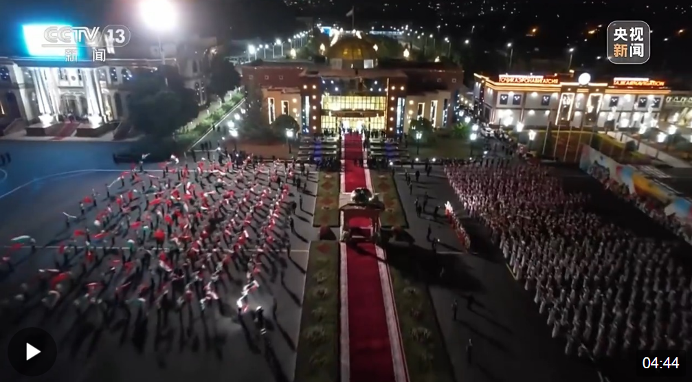1500多名身著民族盛裝的塔吉克斯坦青年表演富有濃郁特色的中塔歌舞,揮舞中塔兩國國旗,表達(dá)對中國最尊貴客人的熱烈歡迎。