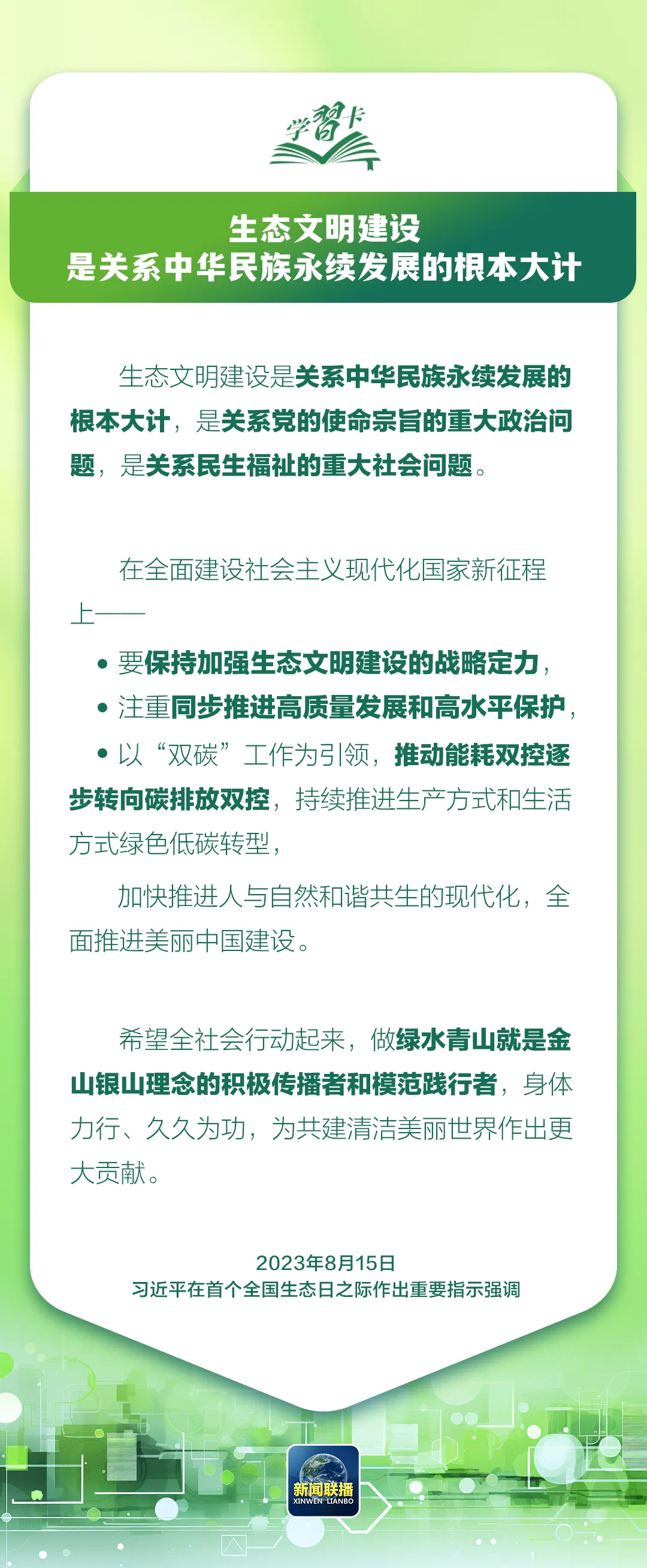 關(guān)于讓綠色低碳發(fā)展成為解決生態(tài)環(huán)境問(wèn)題的治本之策,加快形成綠色生產(chǎn)方式和生活方式,總書(shū)記有不少重要論述,在第二個(gè)全國(guó)生態(tài)日到來(lái)之際,讓我們一起學(xué)習(xí)。