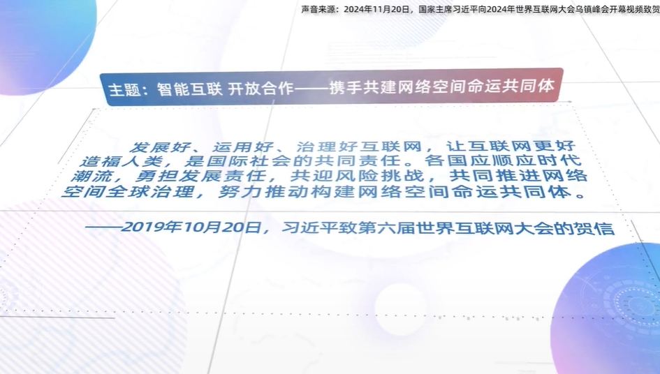 11月20日,國家主席習(xí)近平向2024年世界互聯(lián)網(wǎng)大會烏鎮(zhèn)峰會開幕視頻致賀。習(xí)近平指出,中國愿同世界各國一道,把握信息革命發(fā)展的歷史主動(dòng),攜手構(gòu)建網(wǎng)絡(luò)空間命運(yùn)共同體,讓互聯(lián)網(wǎng)更好造福人民、造福世界。
