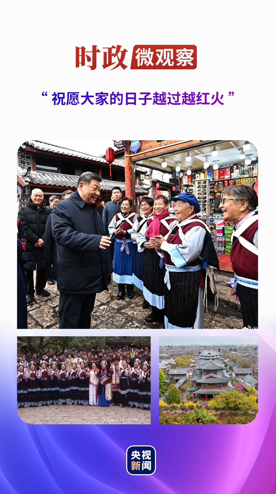 今年3月19日,習(xí)近平總書記再次來到云南考察,在麗江古城沿著石板路邊走邊看,不時(shí)停下腳步同大家親切交流。古城居民和游客見到總書記十分興奮,爭相問好,有的還彈奏樂器、載歌載舞歡迎總書記。習(xí)近平總書記祝福大家,“希望你們的生活幸福安康,就像納西族的大姓‘和’姓一樣,和和美美”。