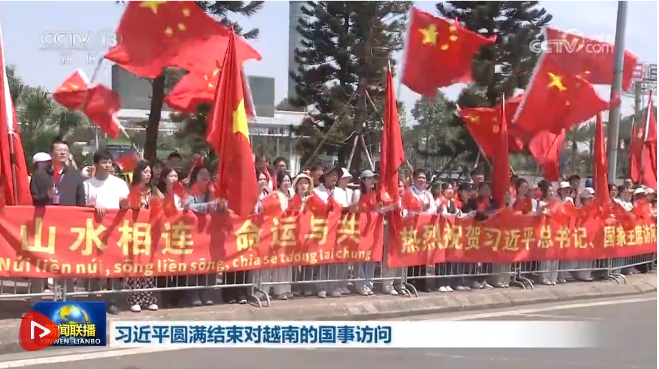 離開河內(nèi)時,越南總理范明政,越共中央政治局委員、中央書記處常務(wù)書記陳錦繡,越共中央書記處書記、中央辦公廳主任黎懷忠等越南黨政領(lǐng)導人和地方代表到機場送行。當?shù)孛癖姾椭匈Y機構(gòu)、留學生代表高舉紅色橫幅,熱烈祝賀習近平訪問越南取得圓滿成功。
