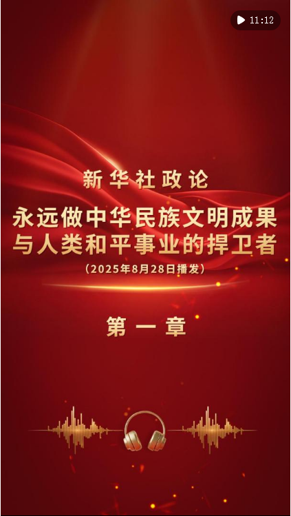 新華社8月28日播發(fā)《新華社政論|永遠(yuǎn)做中華民族文明成果與人類和平事業(yè)的捍衛(wèi)者——寫在中國(guó)人民抗日戰(zhàn)爭(zhēng)暨世界反法西斯戰(zhàn)爭(zhēng)勝利80周年之際》。我們邀請(qǐng)誦讀嘉賓任志宏演播“第一章”。aLH安康新聞網(wǎng)
