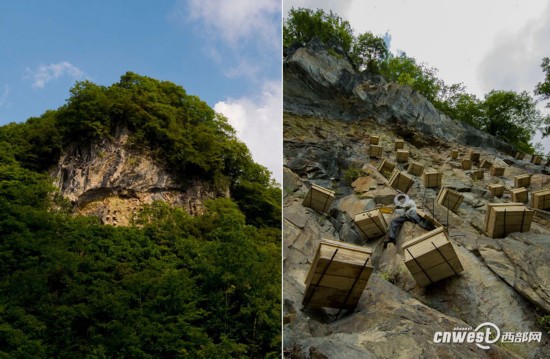 陜西最南端的鎮(zhèn)坪縣地處大巴山腹地,在崇山峻嶺的一處崖壁上,懸掛著一箱箱土蜂,養(yǎng)蜂人攀巖取蜜。