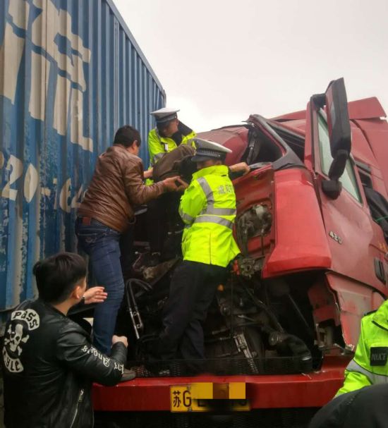 民警了解到,駕駛?cè)酥炷硺否{駛蘇G牌照重型半掛貨車從江蘇拉載百貨運(yùn)往蘭州,行徑福銀高速陜甘界段因大霧引發(fā)交通事故,從而造成同車乘坐人朱某登受傷被困車內(nèi)。駕駛?cè)酥炷硺繁硎,幸得咸?yáng)高速交警果斷處置,受困傷員才得以及時(shí)脫險(xiǎn)。