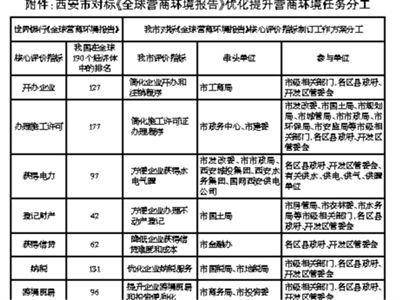 按照《西安市對標(biāo)〈全球營商環(huán)境報告〉優(yōu)化提升營商環(huán)境任務(wù)分工》(見附件),各牽頭部門根據(jù)各自職責(zé),從世界銀行《全球營商環(huán)境報告》中開辦企業(yè)、辦理施工許可、獲得電力、登記財產(chǎn)、獲得信貸、納稅、跨境貿(mào)易7個核心評價指標(biāo)入手,圍繞減環(huán)節(jié)、優(yōu)流程、壓時限、提效率,牽頭制訂具體工作方案,于2017年10月31日前報市行革辦研究審定后組織實施。市統(tǒng)計局會同市行政學(xué)院盡快研究制訂我市縣域營商環(huán)境監(jiān)測評價指標(biāo),強化綜合衡量和定期排名,努力提升全市縣域營商環(huán)境和市場競爭力。