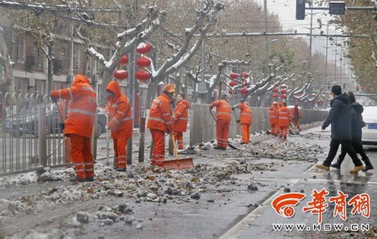 在雁塔區(qū),從1月6日晚至7日14時,5萬余名機(jī)關(guān)干部、市容保潔和綠化養(yǎng)護(hù)工人以及沿街單位志愿者上街清雪。