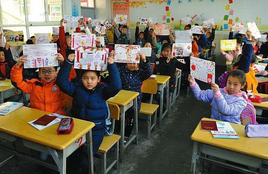 西安一小學(xué)的學(xué)生展示自己創(chuàng)作的海報(bào)作品。陜西日報(bào)記者 杜瑋攝
