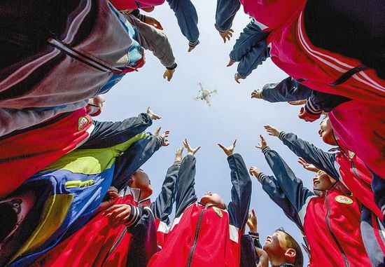 騰空而起的無人機(jī)讓孩子們頓時(shí)歡呼雀躍起來。通訊員 賀粵軍攝