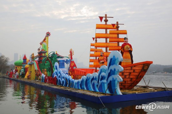 1月22日,記者走進(jìn)大唐芙蓉園,環(huán)芙蓉湖一圈,見2018新春燈會的大型燈組已基本到位,規(guī)模氣勢超大唐芙蓉園歷屆燈會。這組水上燈組濃縮了水陸絲綢之路風(fēng)情。y89安康新聞網(wǎng)