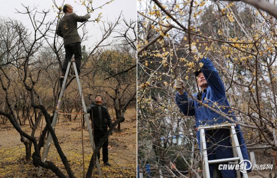 西部網訊(記者 魏永賢) 3月5日,西安興慶宮公園,6名園林工人在臘梅林里摘臘梅花,他們要把臘梅林里的臘梅花全部除掉。