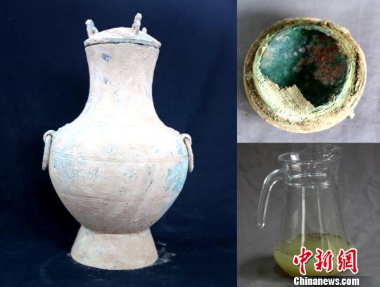 據(jù)介紹,此次出土銅壺的口部以條狀物覆扎有粗布,密封性極好,因此得以保留總量約300毫升的近乳白色透明液體。檢測(cè)后發(fā)現(xiàn),液體中含有較高的羥脯氨酸、谷氨酸等氨基酸以及少量任二酸、月桂酸等脂肪酸等物質(zhì)。其中,羥脯氨酸、谷氨酸等氨基酸的含量分別為4.83ug/g和2.40ug/g,屬于酒類(lèi)物質(zhì)。