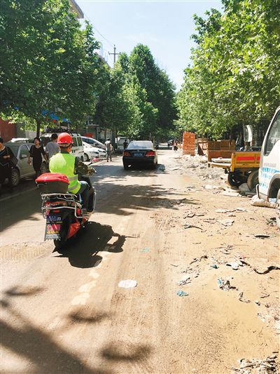 除了擁堵外,臟亂問題更是讓大家煩心。記者看到,在體育館東路北段的西側(cè),建筑垃圾、磚塊堆、塑料袋和廢棄材料等隨處可見、任意堆積,人行道已不復(fù)存在。一工地內(nèi)渣土與水混合在一起,使這條路泥濘不堪,空氣中也彌漫著嗆人的塵土味道,有的居民出行戴了口罩!斑@個工地在這里一個多月了,垃圾、泥土、揚塵到處都是,灑過水后路上又變得泥濘,統(tǒng)共一百來米的路,大路走不成,人行道被霸占。”家住碑林區(qū)工商局家屬樓的魏師傅推著嬰兒車,正在小心翼翼地邊走邊看,以躲避過往車輛。