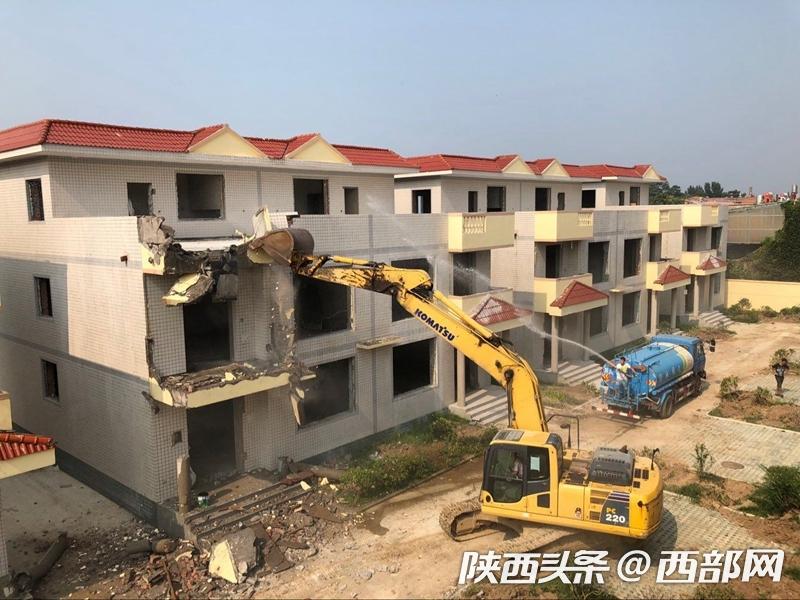 在灤鎮(zhèn)街道灃峪口村,一圈圍墻里的十棟別墅已經(jīng)拆掉了門窗,清理了內(nèi)部裝修,街道工作人員調(diào)集大型機(jī)械,集中人力,開始全力拆除主體部分。