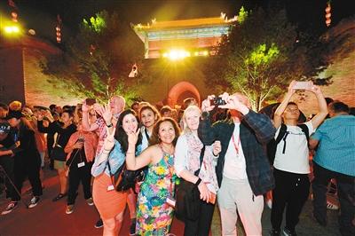 昨日,外國(guó)游客在南門里合影留念。記者 竇翊明 攝